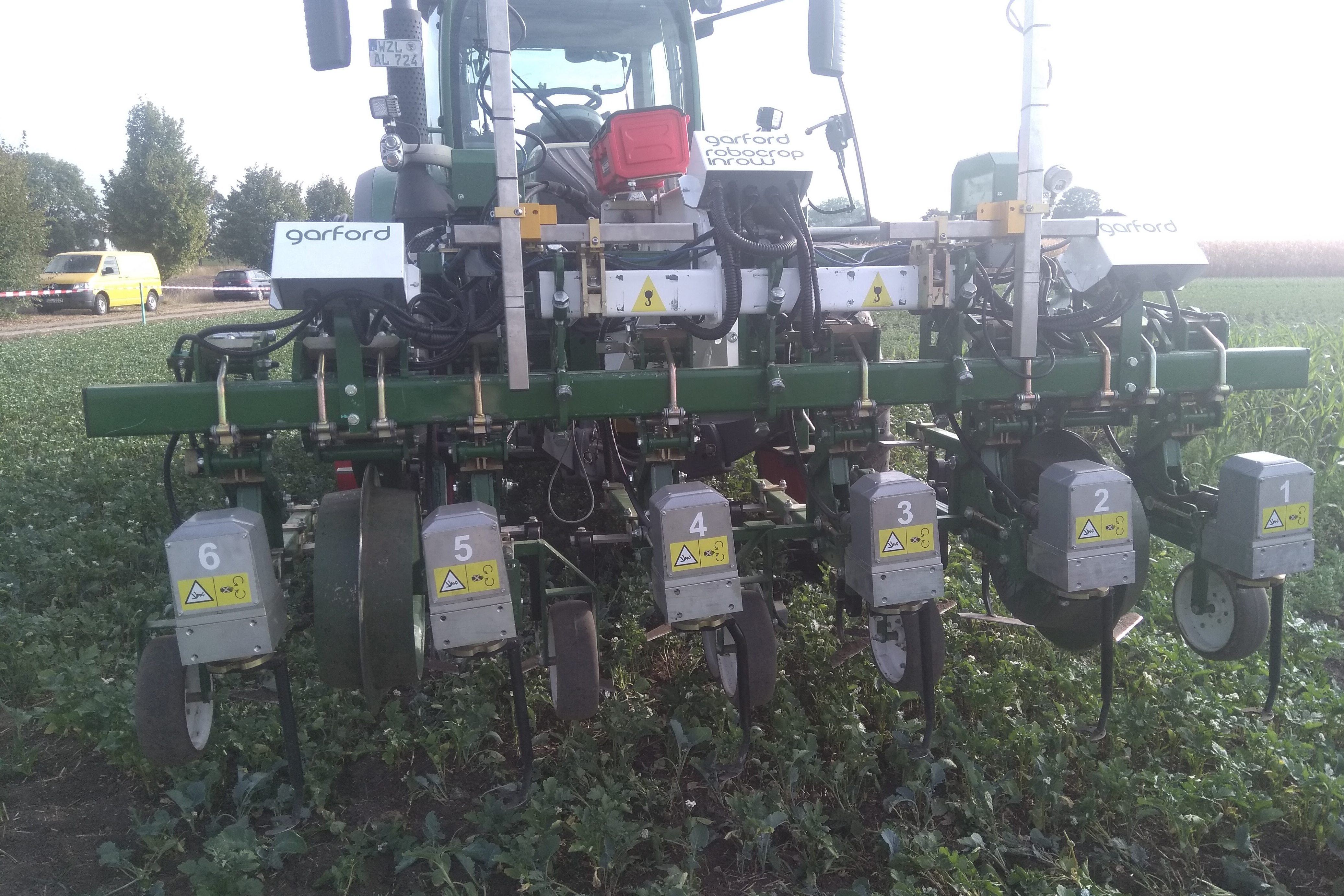 Für den Feldtag im September hatte er zu drei Saatterminen Zuckerrüben, Mais und Kichererbsen gesät, um den Hackmaschineneinsatz in unterschiedlichen Stadien der Kultur- bzw. Beikrautpflanzen testen zu können. Auf dem Feldtag kamen zwei kameragesteuerte Hackmaschinen zum Einsatz: Garford Robocrop Inrow im Frontanbau mit rotierenden Hackwerkzeugen und K.U.L.T. (Kress) Hacke im Heckanbau mit seitwärts arbeitenden Hackscharen.