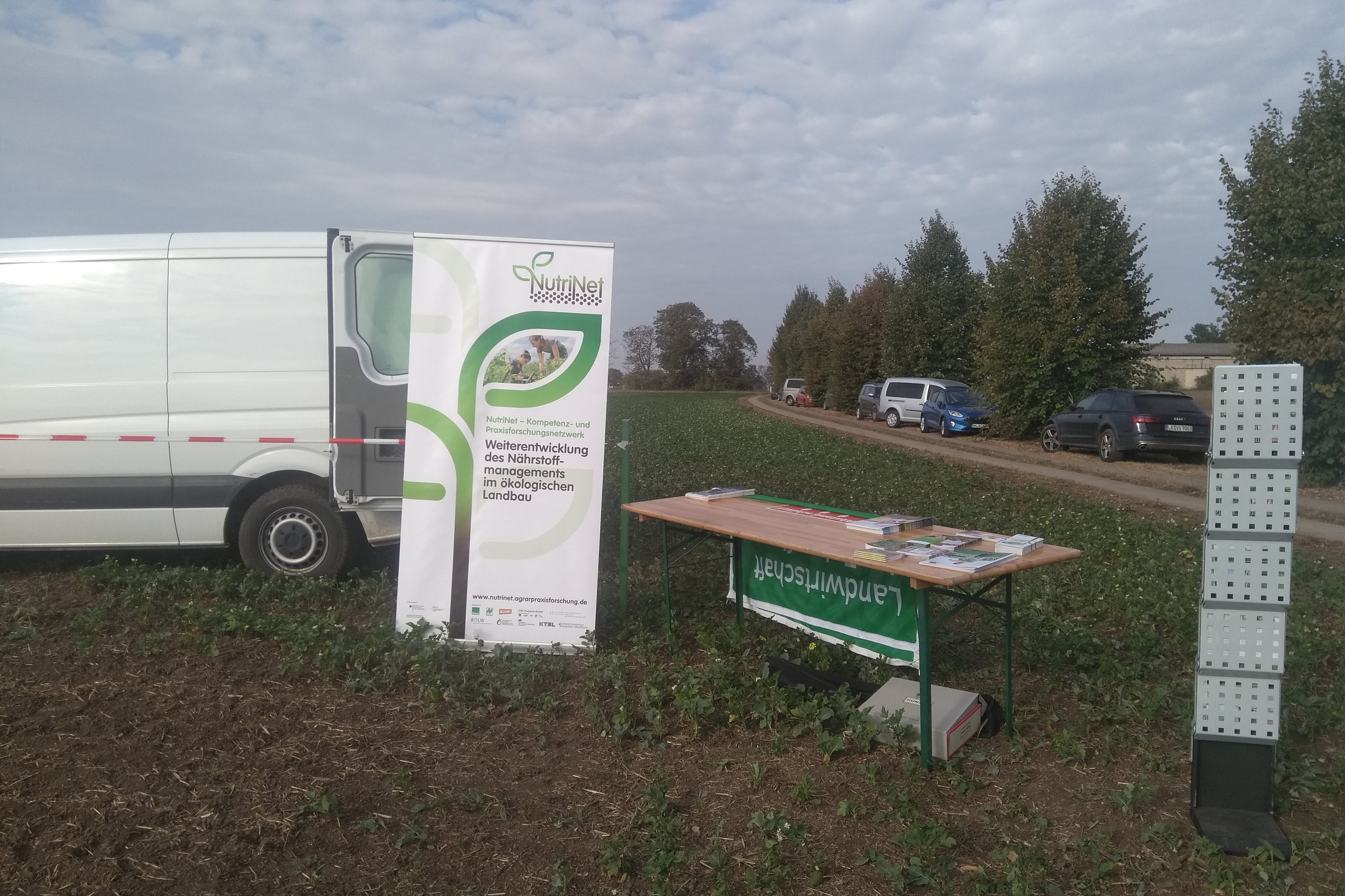 Zu Beginn des Feldtages stellte Ansgar Laame seinen 260 ha Ackerbaubetrieb vor, auf dem er schon häufiger Praxisversuche angelegt hat. 2019 hat er begonnen, den in der Magdeburger Börde liegenden Betrieb auf ökologische Bewirtschaftung umzustellen, seit 2020 nimmt er am Praxisforschungsprojekt NutriNet teil. Dafür legt er auf einer Fläche den NutriNet-Netzwerkversuch Bodenuntersuchungsmethoden/Düngungsmaßnahmen an.