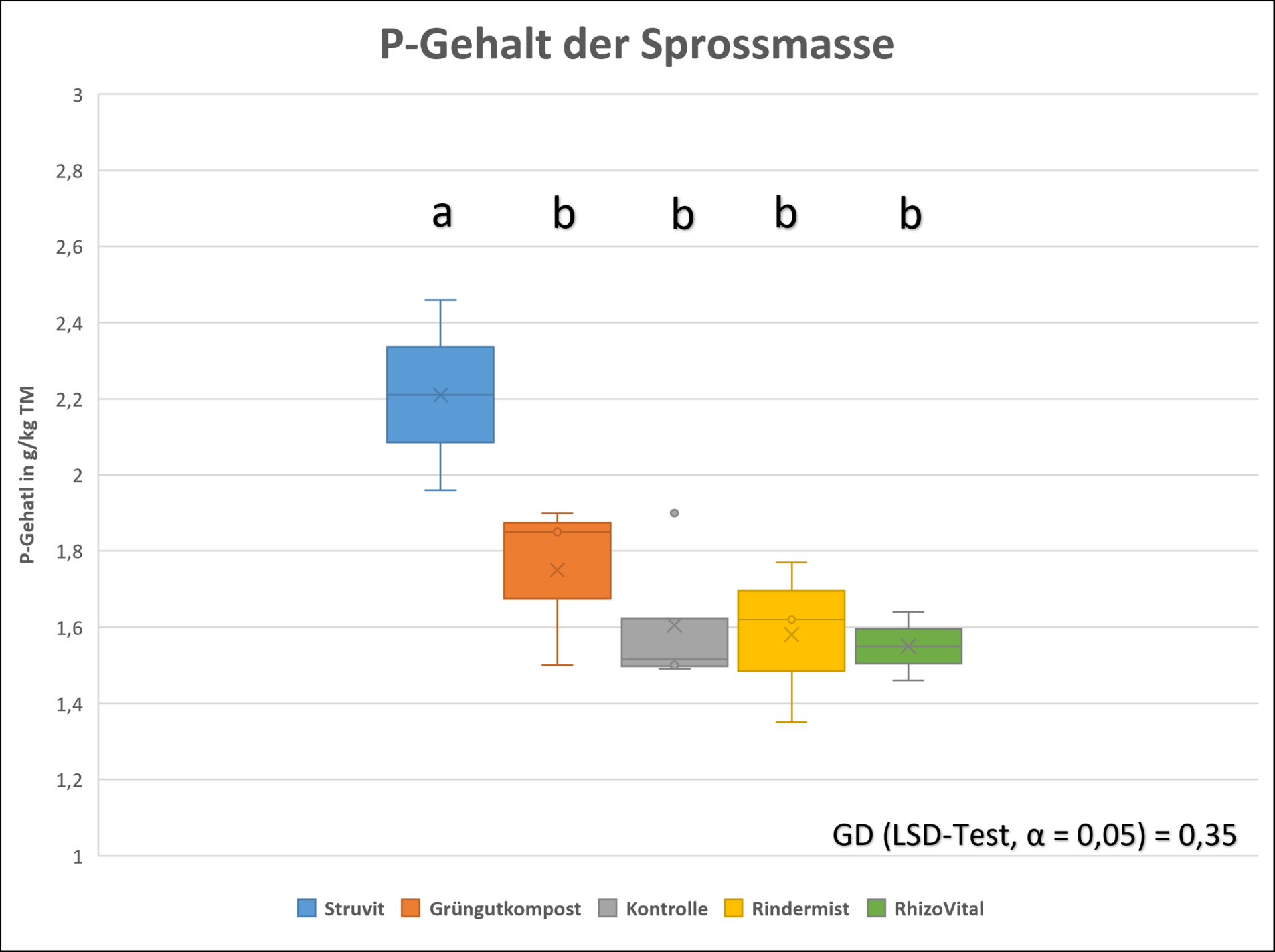 Am 01.06.2021 wurde pro Parzelle Pflanzenproben genommen. Bei der anschließenden Sprossmasseanalysen im Labor wurden die P-Gehalte der Sprossmassen bestimmt. Der P-Gehalt der Weizen-Sprossmasse ist bei den mit Struvit gedüngten Winterweizen-Pflanzen signifikant höher als bei den anderen Düngevarianten.