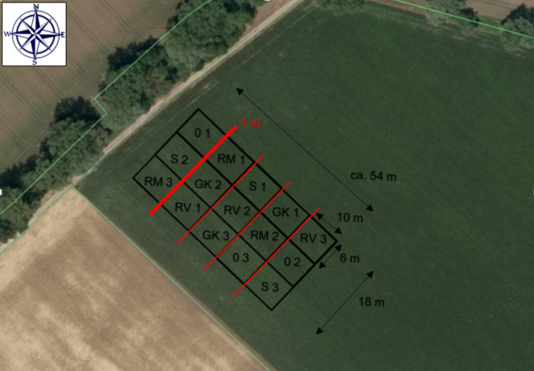 Die hohen Niederschlagsmengen und die räumliche Nähe zum angrenzenden Bachlauf hatten zur Folge, dass im Frühjahr Teile der Versuchsanlage unter Wasser standen. Dies bedingte den Totalausfall mancher Parzellen, weshalb ein Teil der Parzellen vor der Düngerausbringung an anderer Stelle neu angelegt werden musste. Trotz dieser Anpassung ist ein deutlicher Zusammenhang zwischen der örtlichen Lage der Parzellen und dem Ertrag erkennbar, welcher zur Feldmitte hin ansteigt. Von einer statistischen Auswertung des Ertrags wurde aus diesem Grund abgesehen.