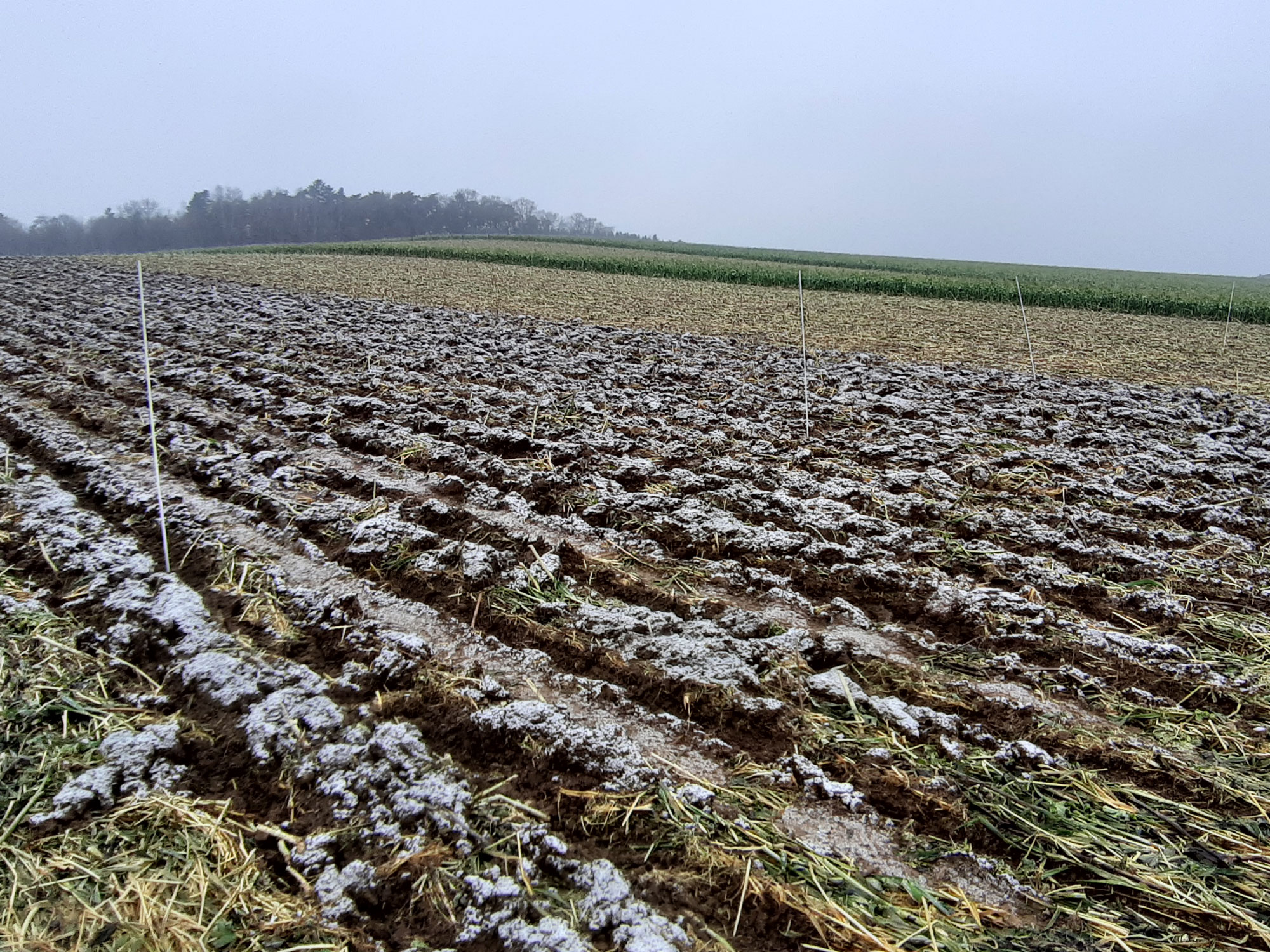 Der Betrieb baut die Folgekultur Körnermais in der Regel auf Dämmen an. In diesem Versuch wird untersucht, durch welche Methoden der Zwischenfruchtbearbeitung sich Stickstoffverluste am besten reduzieren lassen und wie sich dies auf den Ertrag der Folgekultur auswirkt. Unter anderem wird geprüft, ob sich die Nährstoffverluste reduzieren lassen, wenn die Dämme bereits im Herbst angelegt werden.