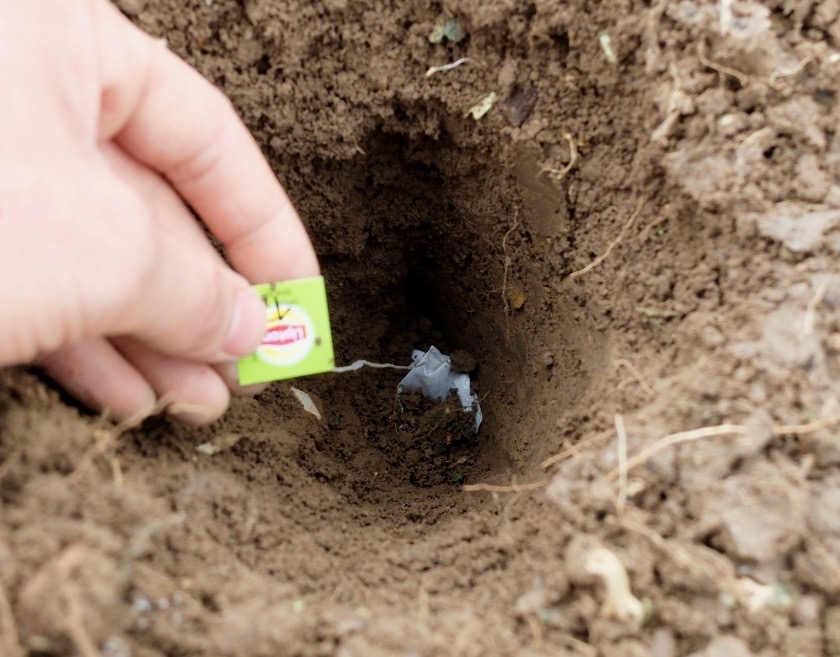 - Ausgangsgewicht des Lipton-Teebeutels ohne und mit Inhalt wiegen (0,000g). Gefüllten Beutel exakt beschriften und in 8cm Tiefe vergraben.