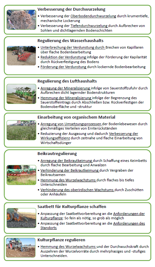 Vor einem Eingriff ist es wichtig, das Ziel einer Bearbeitungs- bzw. Pflegemaßnahme zu definieren und unter Abwägung der positiven und negativen Auswirkungen die dazu passende Maßnahme auszuwählen. Die folgende Abbildung gibt einen Überblick über mögliche Ziele und dazu passende Bodenbearbeitungsmaßnahmen: