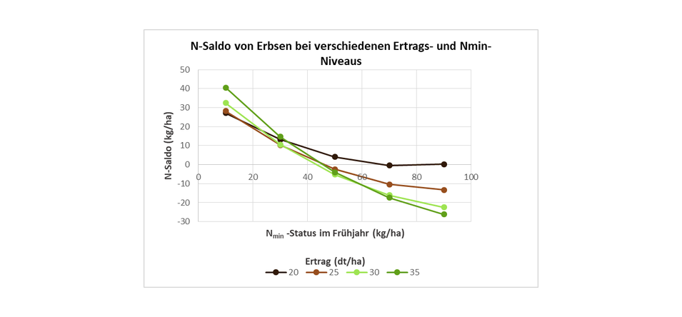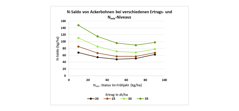 Abbildung 1 zeigt die Zusammenhänge für die Ackerbohne. Anschaulich wird, dass kalkulatorisch mit steigenden Nmin-Werten die N-Salden sinken, jedoch nicht unter 0 fallen. Die ermittelten N-Salden nehmen mit zunehmendem Ertrag zu.