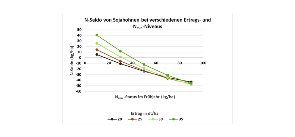 Die folgenden Grafiken verdeutlichen den Sachverhalt. Dargestellt sind die N-Salden für Ackerbohnen, Erbsen und Sojabohnen für verschiedene Ertrags- und Nmin-Niveaus. Grundsätzlich zeigt sich bei allen Kulturen, dass sich ein erhöhter Nmin-Wert im Frühjahr negativ auf die Fixierleistung auswirkt und der N-Entzug durch die Ernte die Fixierleistung überschreiten kann.