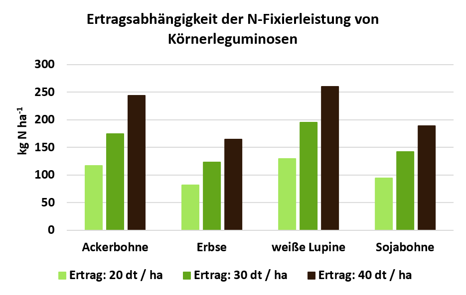 Die N-Fixierleistung von Körnerleguminosen ist in der Regel deutlich geringer als bei Feinleguminosen und wie bei diesen vom Ertrag abhängig. In der folgenden Abbildung dargestellt sind für die wichtigsten Arten exemplarisch N-Fixierleistungen auf den Ertragsniveaus 20, 30 und 40 dt/ha. Auf mittlerem Ertragsniveau werden in der Regel zwischen 100 und 150 kg Stickstoff fixiert. Bei der Ackerbohne sind die N-Fixierleistungen bei mittleren Erträge etwas besser, bei der Erbse etwas schlechter. Vergleichbare N-Fixierleistungen wie bei den Feinleguminosen sind bei Körnerleguminosen erst bei außergewöhnlich hohen Erträgen zu erwarten.