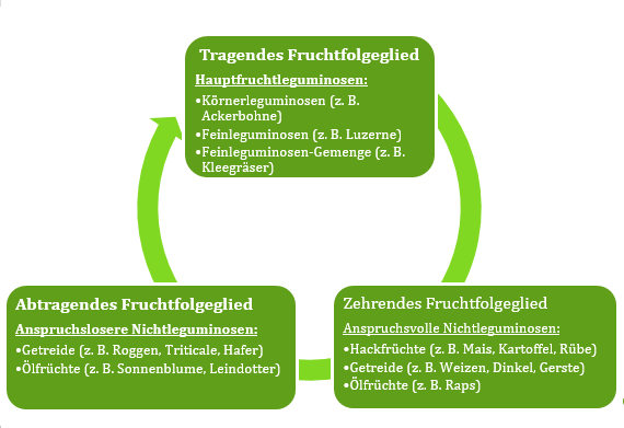 Im ökologischen Landbau hat die Fruchtfolge einen wesentlichen Einfluss auf die Nährstoffversorgung, aber auch auf die Regulierung von Beikräutern, Krankheiten und Schädlingen sowie auf die Bodenstruktur und den Humusgehalt. Für die Stickstoffversorgung ist vor allem der Anteil von Leguminosen in der Fruchtfolge von Bedeutung.