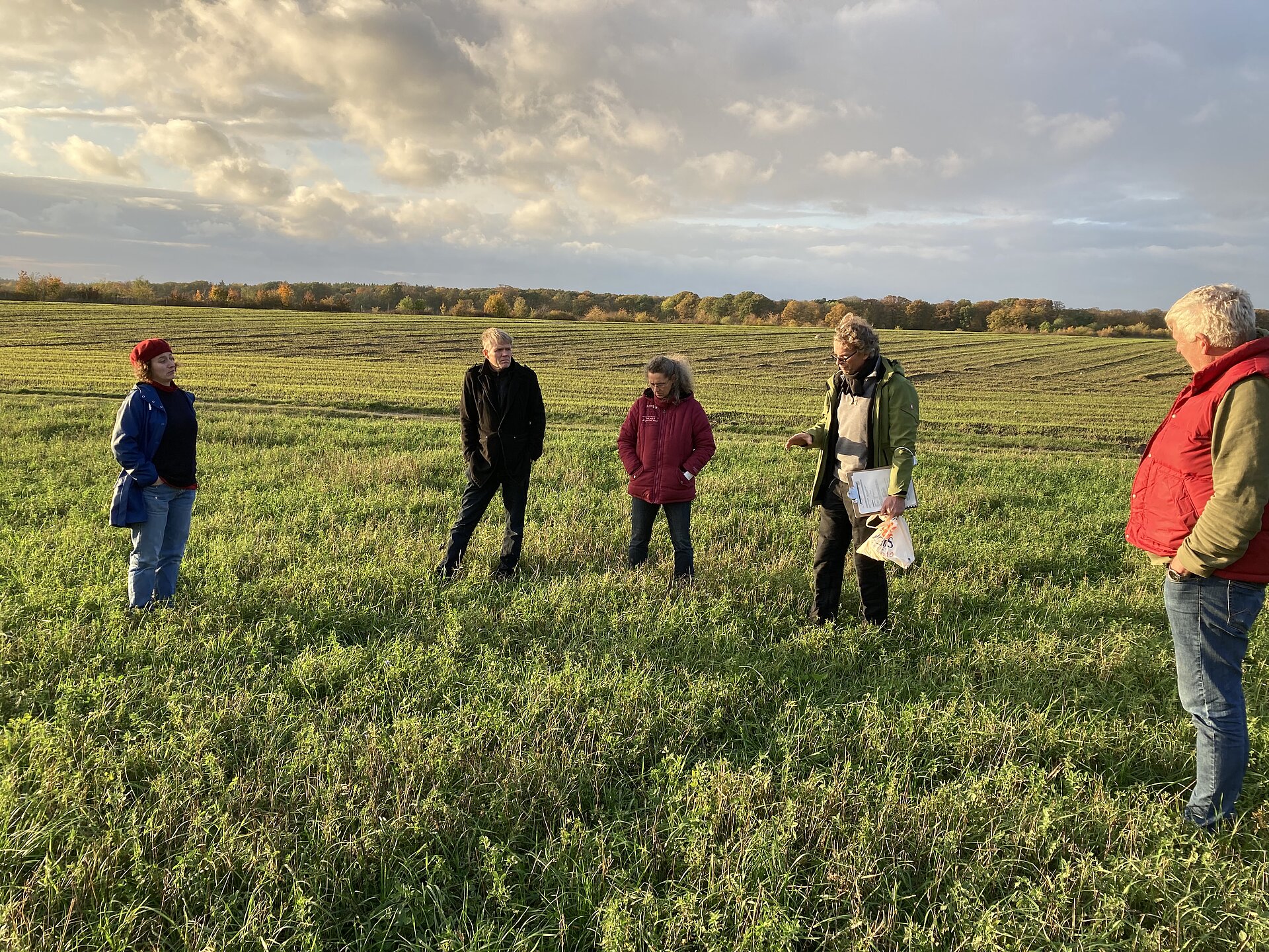 Im dritten Teil des Workshops besuchte die Gruppe den Ökobetrieb Behringhof. Nach einer Betriebsvorstellung durch den Betriebsleiter Ralf Behring hatten die Lehrer*innen Gelegenheit Fragen zu stellen. Im Anschluss führte der Betriebsleiter die Gruppe auf eine Fläche mit einer Luzernekleegras-Untersaat. Der Praxisversuch auf der Nachbarfläche musste zur Queckenbekämpfung umgebrochen werden.